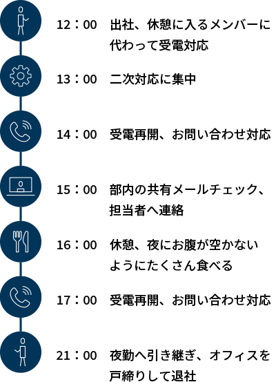 遅番の日のスケジュールです。通常勤務(9:00~18:00)の人が休憩に入るタイミングで遅番勤務がスタートし、誰かが休憩中のときは他のメンバーが穴埋めするような感じで、常に対応できる体制を作っています。